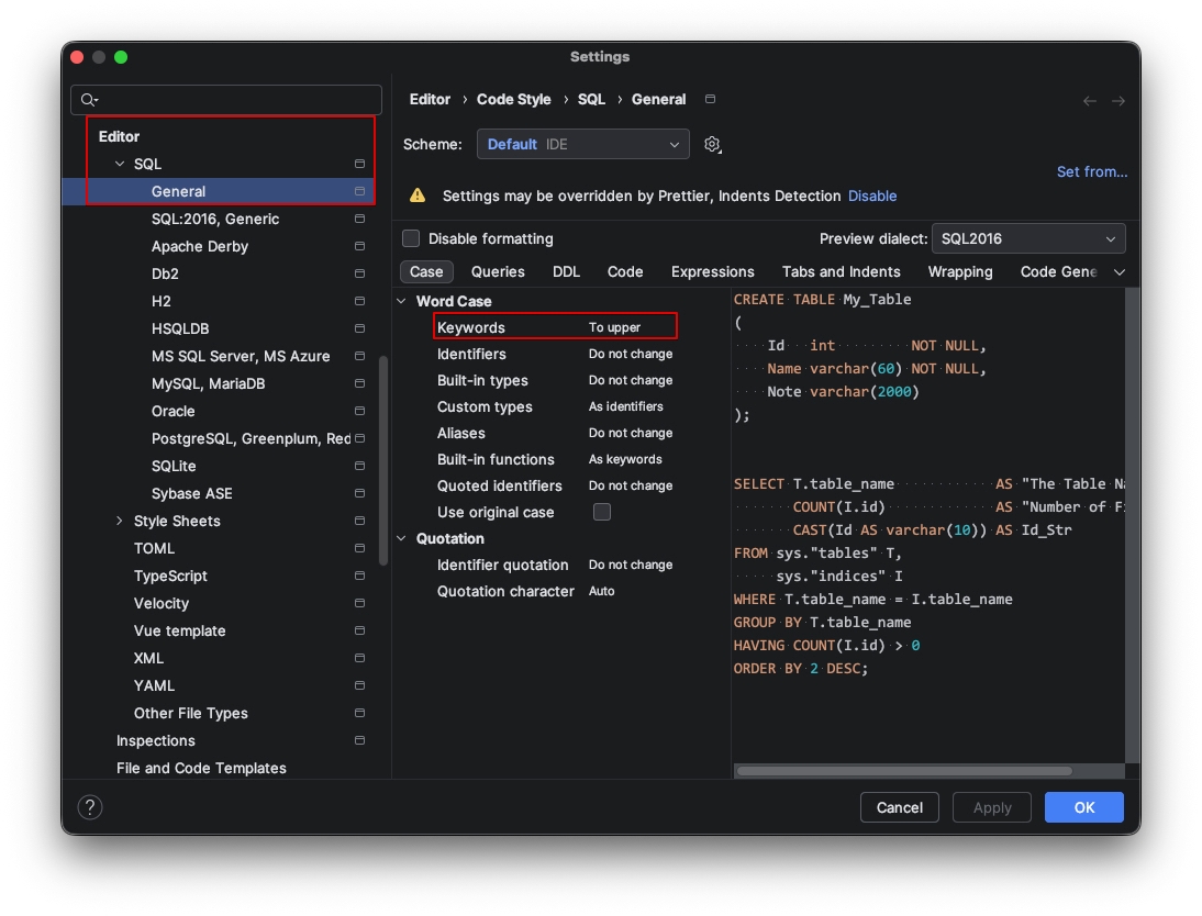 SQL 예약어 대문자로 작성하기 @장태근· October 10, 2025 · 1 min read IDEIDE에서 SQL을 작성하다 보면 SELECT, FROM, WHERE 같은 예약어를 소문자로 쓰기도, 대문자로 쓰기도 한다. 어떻게 하면 일관되게 작성할 수 있을까? 해결 작은 설정 하나로 일관성 있는 SQL 작성이 가능해졌다. IDE 설정하기 SQL 예약어 대문자로 자동완성 File | Settings | Editor | Code Style | SQL | General > Case <참고 자료> 데이터리안 'SQL 가독성을 높이는 다섯 가지 사소한 습관' Previous PostIntelliJ에서 파일 끝에 Newline 자동으로 추가하기Next Post오늘도 우리는 나선으로 걷는다@장태근개발자. 명료한 생각이 명료한 글이 된다.